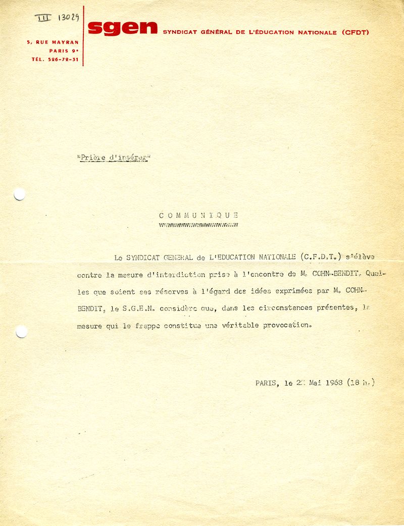| Titre | [Communiqué du SGEN contre l'expulsion de Daniel Cohn-Bendit] |